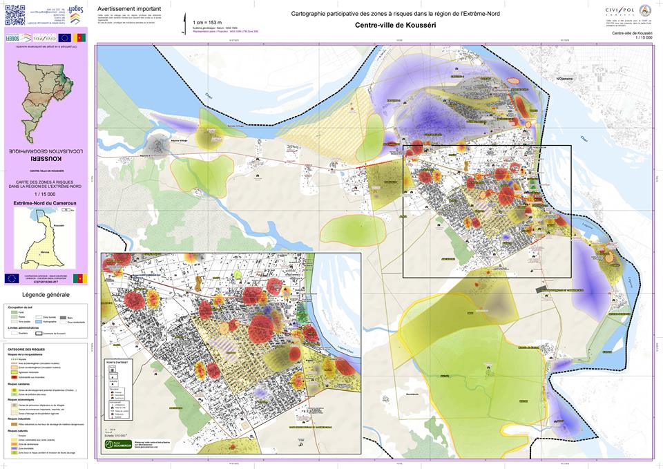 Dans plusieurs régions du Cameroun des cartes des risques aux échelles allant du 1/100 000 au 1/10 000. Description des types d’aléas, Cartographie de synthèse des risques accompagnée de base de données.